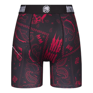 The Rag 2 Boxer Briefs in Black feature all over custom Metal Mulisha bandana print and large M/M skull logo on wearer's left leg.