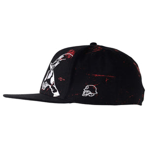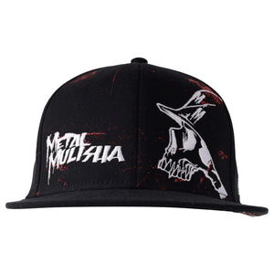 The Metal Mulisha Attack Flex Hat in Black features Black with Red splatter printed on all panels with 2 large Metal Mulisha embroideries in White on the front panels, small Metal Mulisha logo embroidery on back center and side, M/M skull underbill print, and custom printed internal seam taping. Flat bill with ability to curve.