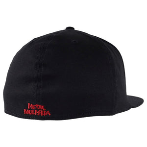 The Metal Mulisha Compound Flex Hat is made with cotton twill fabric and features front tonal black allover print with red splatter print on wearer's front left panel that drips onto the bill, with Metal Mulisha Helmet embroidery in Black over the red splatter print, small M/M print undervisor, back center Metal Mulisha embroidery, custom printed internal seam taping, and new comfort sweatband. 98% Cotton / 2% Spandex