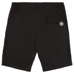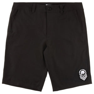 The Metal Mulisha Crooked Hybrid Boardshorts will dominate in & out of the water. With a lightweight, fast drying and slightly stretchy boardshort material they are comfortable and adaptable to anything and look like a regular pair of shorts. Both front pockets have zippers to make sure nothing falls out of the mesh pockets. The back pocket has a zipper pocket flap. Front zipper fly with a button attached with sturdy nylon...you won't bust buttons off like the ones attached with thread. Front left leg has Chevron logo patch and back pocket has an embroidered M/M 99 emblem. 22" outseam so they are a little longer than you find from most surf brands.