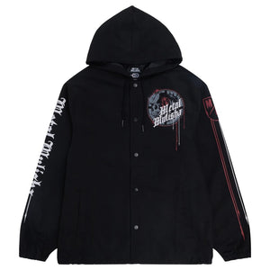 The Nerve Coaches Jacket in Black with Grey, Red and White screenprints on back, front left, and arms of the jacket. 100% poly hooded coaches jacket, water resistant processed shell with poly taffeta lining, built-in hood with adjustable drawcord, custom screen printed Metal Mulisha designs at chest and back, matte black metal snap closure, two slash hand pockets, elastic cuffs and adjustable drawcord hem.