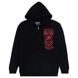 The Blue Collar Heavyweight Zip Hoodie in Black. This Hoodie features custom screen prints on the front and back in Red. The heaviest weight fleece we offer, it's built like a tank yet soft and comfortable and has a generous relaxed fit that is true to size.