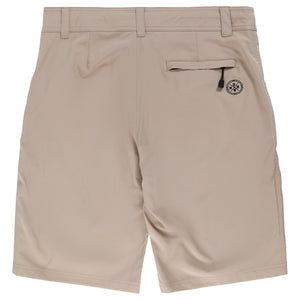 The Metal Mulisha Pismo Hybrid Boardshorts in Khaki! With a lightweight, fast drying and slightly stretchy boardshort material they are comfortable and adaptable to anything and look like a regular pair of khaki shorts. Both front pockets and back pocket have zippers to make sure nothing falls out of the mesh pockets. Front zipper fly with a button attached with sturdy nylon...you won't bust buttons off like the ones attached with thread. Internal drawstring to adjust fit without a belt. Front left leg and back pocket have an embroidered M/M 99 emblem. 22" out seam so they are a little longer than you find from most surf brands.